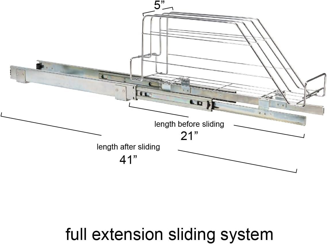 Designed for versatility and ease of installation, this tool fits seamlessly into most kitchen cabinet spaces. Customers love its space-saving attributes and its smooth, full-extension ball bearing slides, as reflected in top-rated reviews on Staples and Walmart. According to the manufacturer, the chrome organizer is manufactured with durability in mind and supports multiple bakeware or cookware pieces.