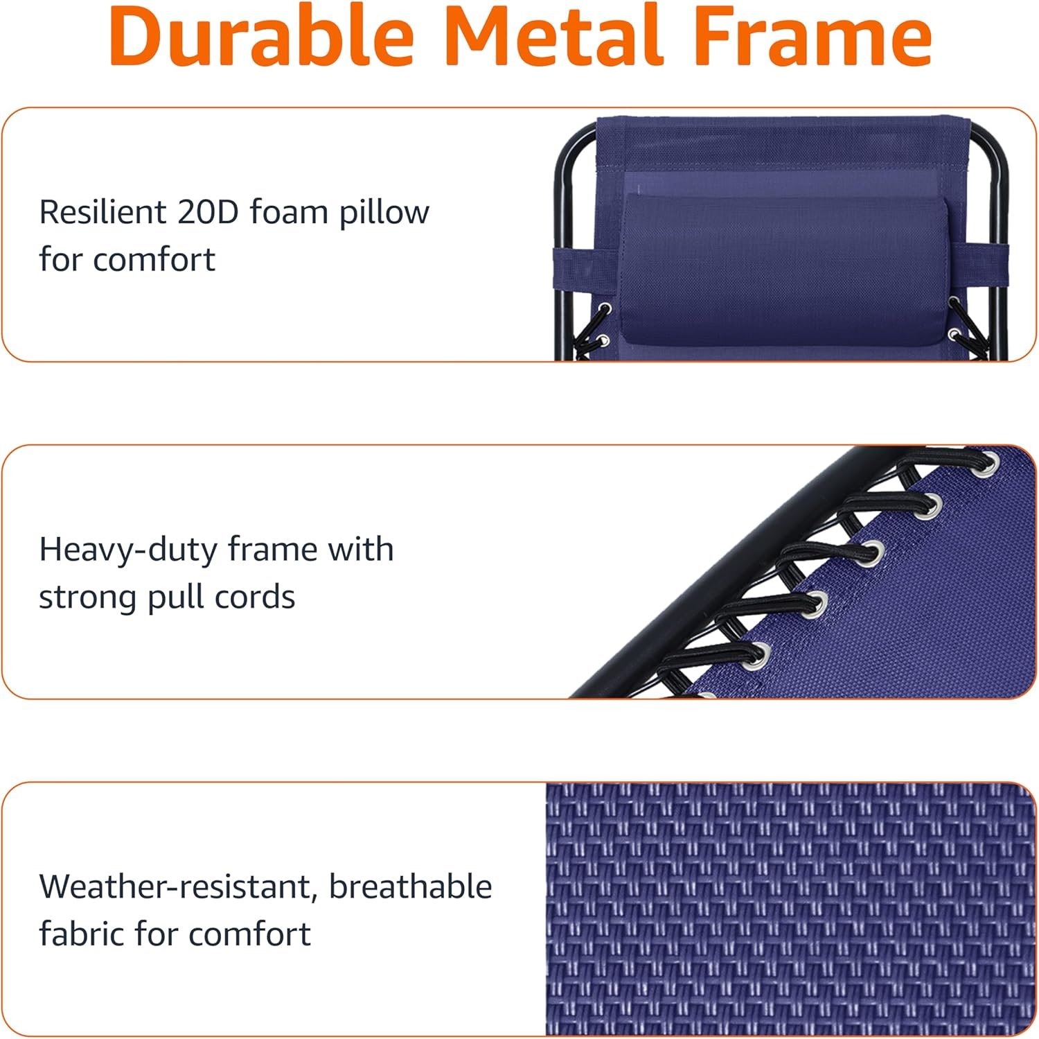 - Weather resistant materials — Textilene fabric seat with elastic cording ensures durability against sun, rain, and moisture, combining with a powder-coated steel frame for extra resilience.