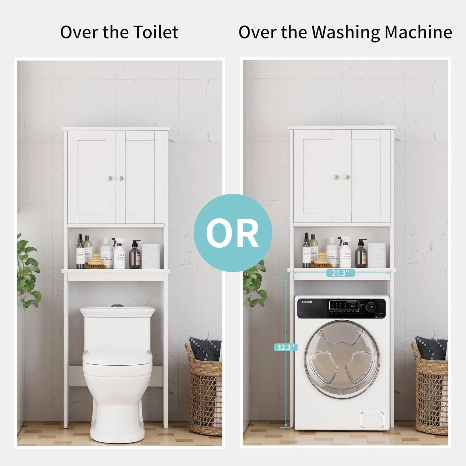 Maximize your bathroom space with the Shintenchi Over The Toilet Storage Cabinet, a sleek and stable organizer featuring a custom adjustable shelf and anti-tip device for added safety. Made from eco-friendly FSC-certified wood, this multi-functional shelf fits over toilets, washing machines, or entryways, offering both open and closed storage options. Its timeless white design complements any décor, while easy assembly and maintenance make it a smart, hassle-free addition to any home.